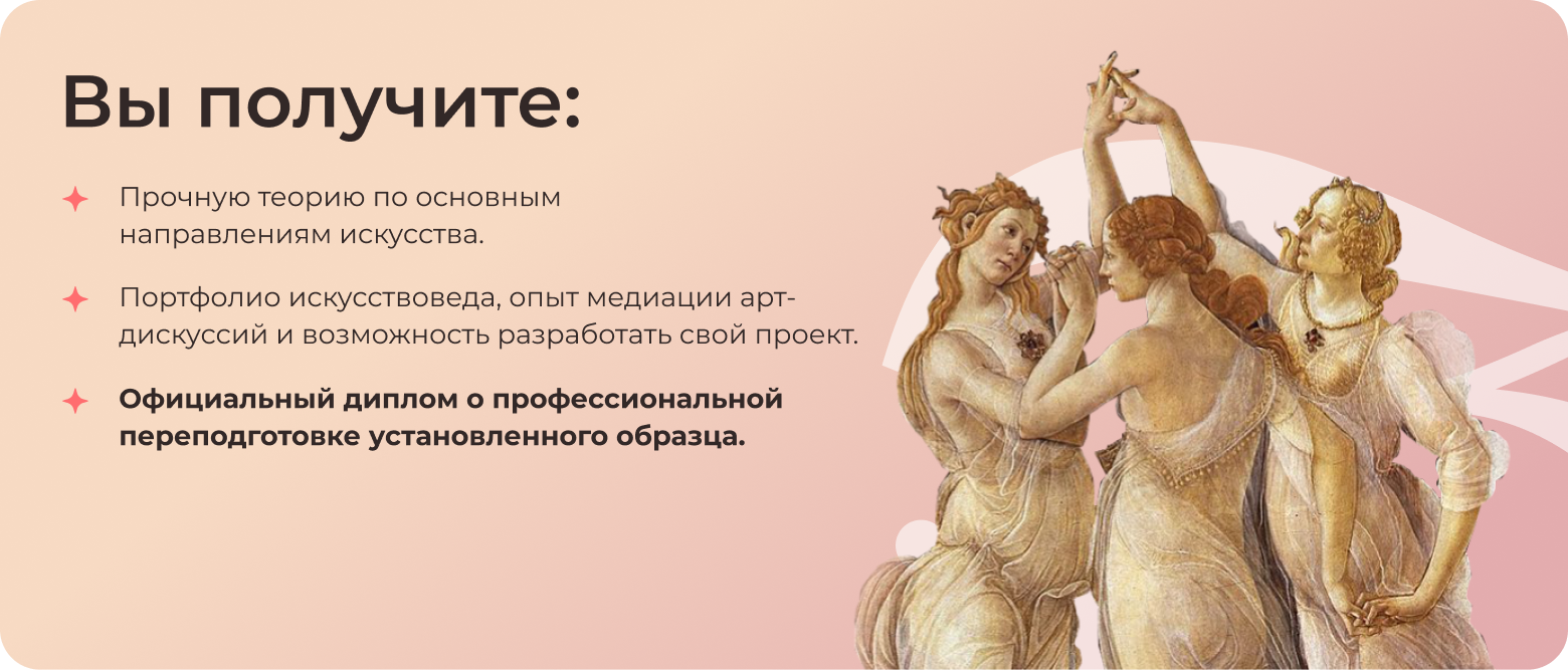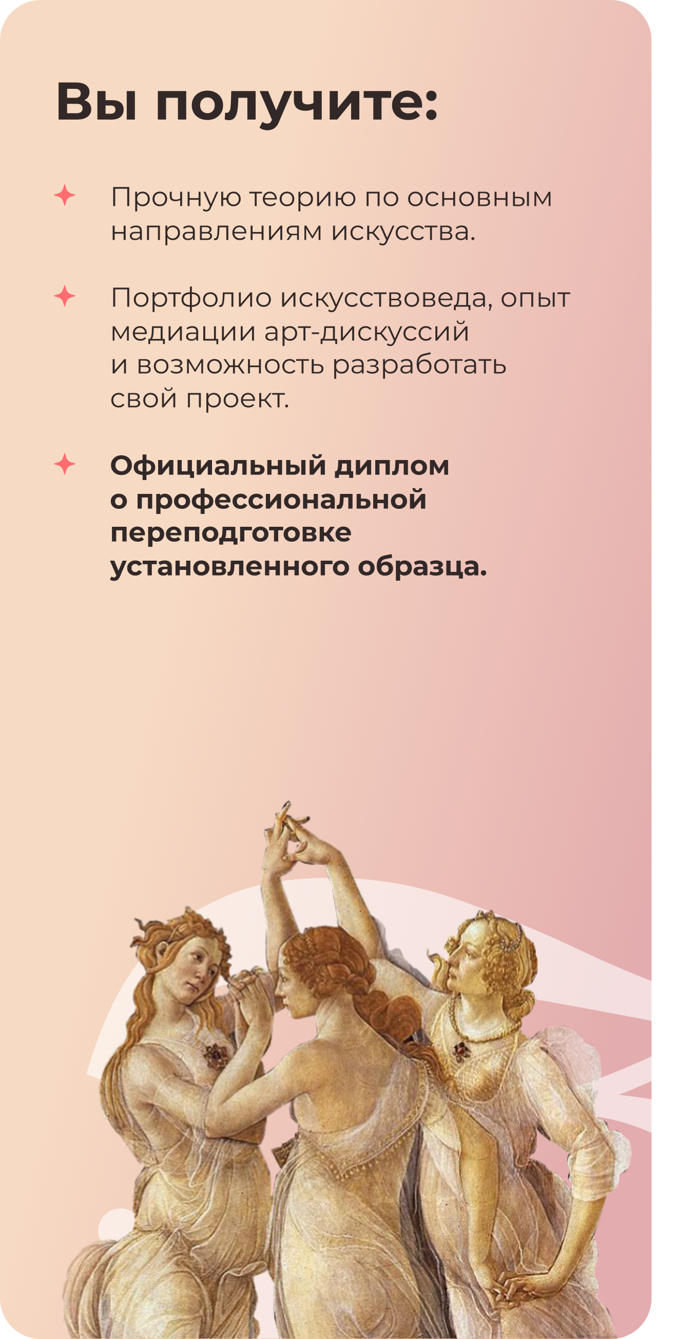 Сделайте первый шаг к получению лучшей профессии для женщины и диплому искусствоведа. Пройдите отбор — и Анастасия оплатит за ваше обучение до 120 000 ₽